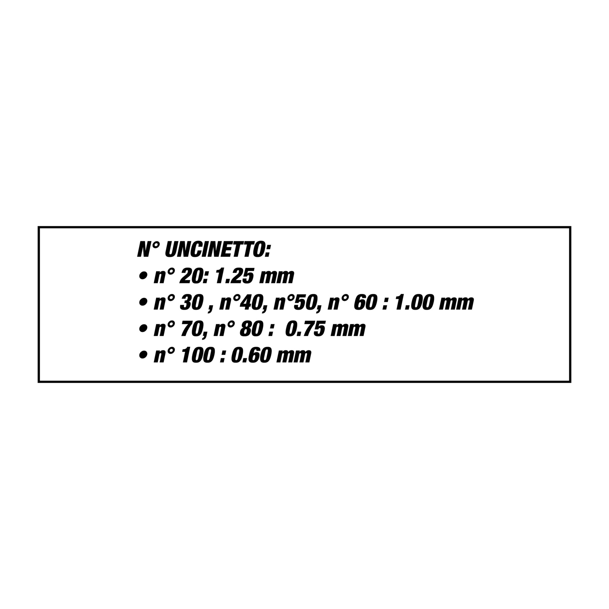 - Indicazioni generali: Gros. 20 - 20 g / 160 m Uncinetto n.1,25 mm Gros. 30 - 20 g / 190 m Uncinetto n.1 mm Gros. 40 - 20 g / 233 m Uncinetto n.1 mm Gros. 50 - 20 g / 266 m Uncinetto n.1 mm Gros. 60 - 20 g / 300 m Uncinetto n.1 mm Gros. 70 - 20 g / 330 m Uncinetto n.0,75 mm Gros. 80 - 20 g / 366 m Uncinetto n.0,75 mm Gros. 100 - 20 g / 366 m Uncinetto n.0,75 mm