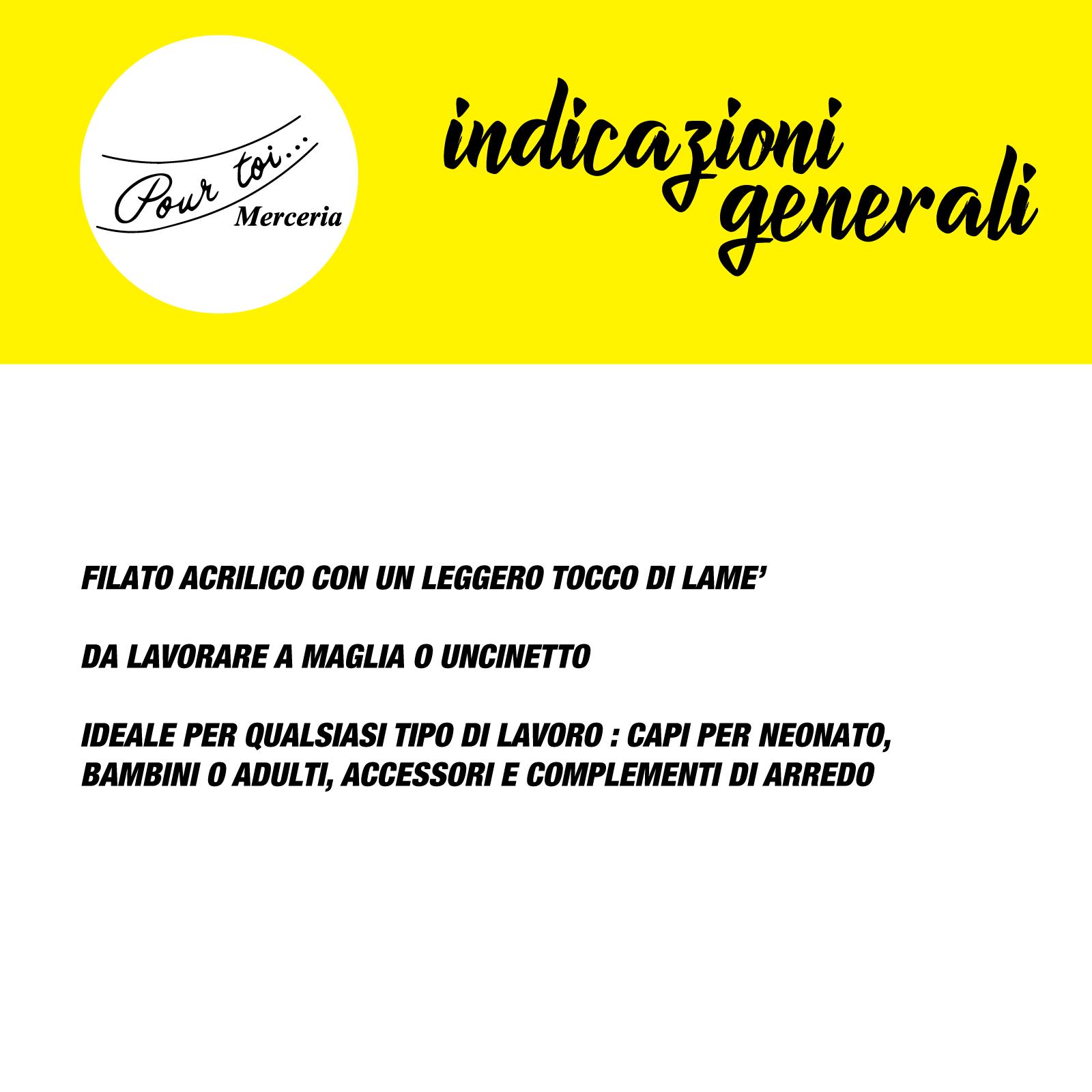 Lisa Lurex è un filato caratterizzato da un filo di lurex che dona luce a tutti i capi. Ideale per realizzare maglioni, sciarpe, scaldacollo, cappelli. Colori disponibili: Bianco 1, Panna 2, Crema 3, Verde 4, Blu 5, Rosa 6, Ciclamino 7, Rosso 8, Grigio 9, Nero 10, Nero/Oro 11, BluNotte/Argento 12, VerdeSmeraldo/Argento 13, Lavanda 15. Specifiche del prodotto: - Composizione: 97% acrilico 3% poliestere metallizzato - Gomitolo da 50 g - 133m - Ferri 4- 4,5 I tempi di spedizione stimati variano dai 2 ai 4 giorni lavorativi.