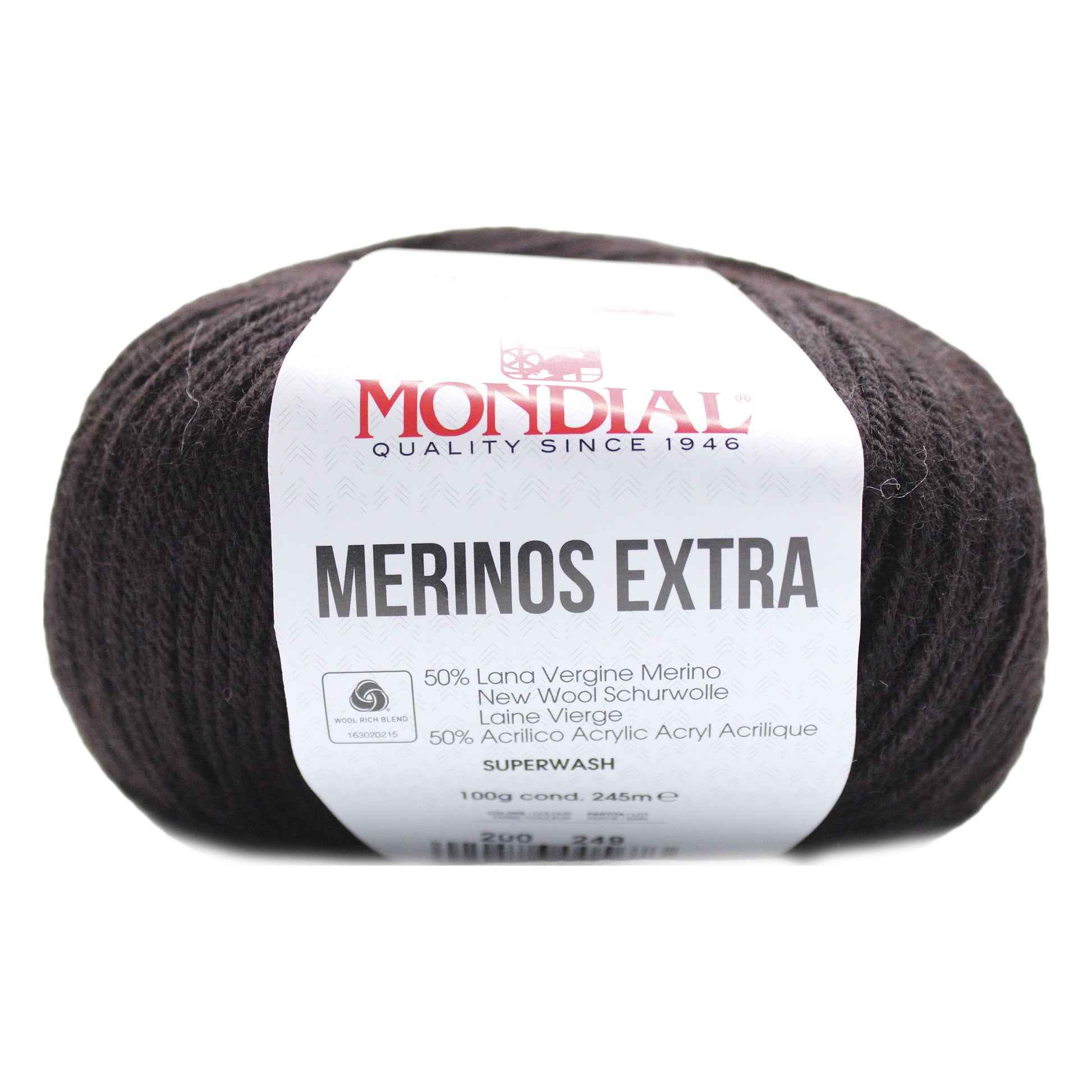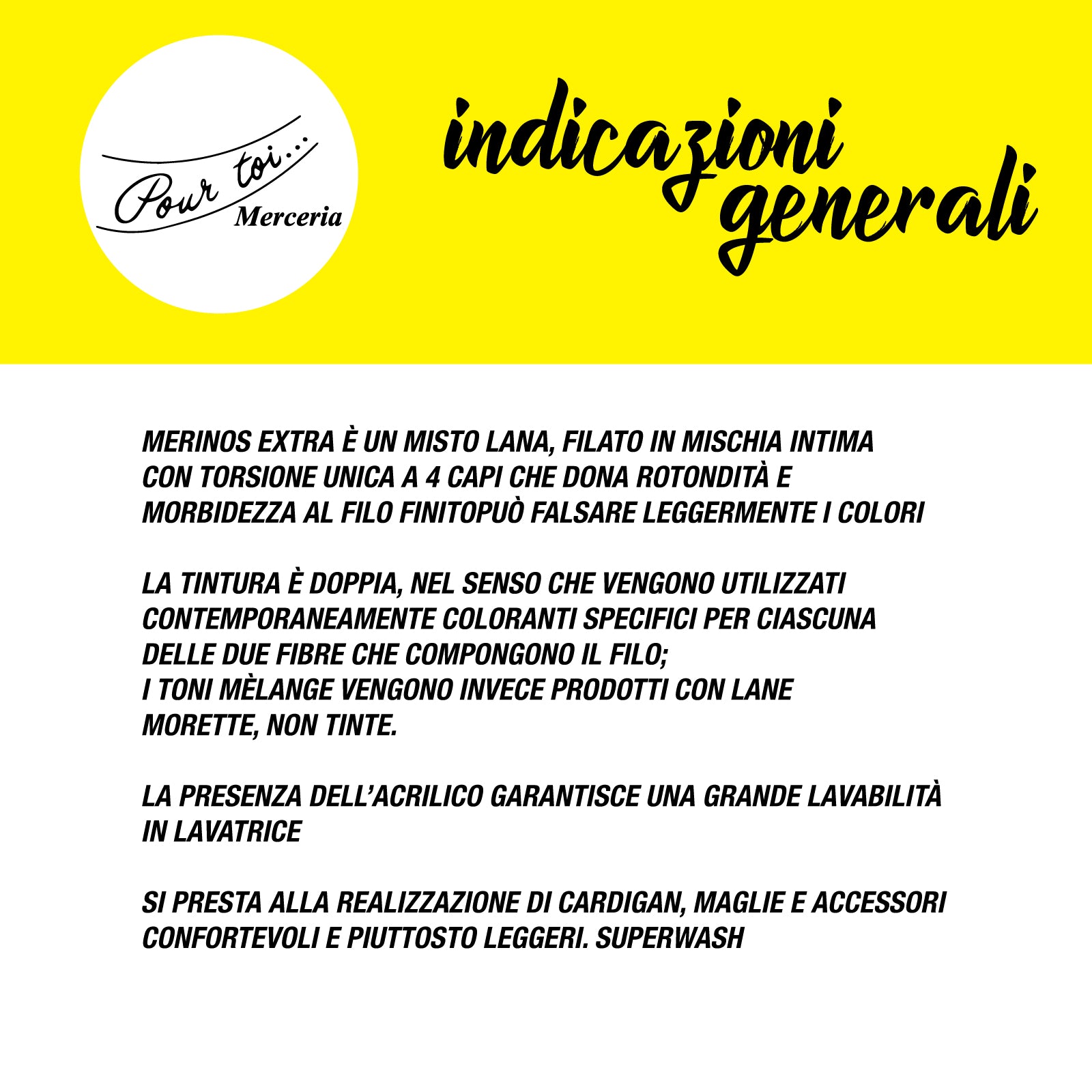 Merinos Extra è un misto lana, filato in mischia intima con torsione unica a 4 capi che dona rotondità e morbidezza al finito filo. La tintura è doppia, nel senso che vengono utilizzati contemporaneamente coloranti specifici per ciascuna delle due fibre che compongono il filo; i toni melange vengono invece prodotti con lane Morette, non tinte. La presenza dell'acrilico garantisce una grande lavabilità in lavatrice. Merinos Extra si presta alla realizzazione di cardigan, maglie e accessori confortevoli e piuttosto leggeri. SUPERLAVAGGIO.