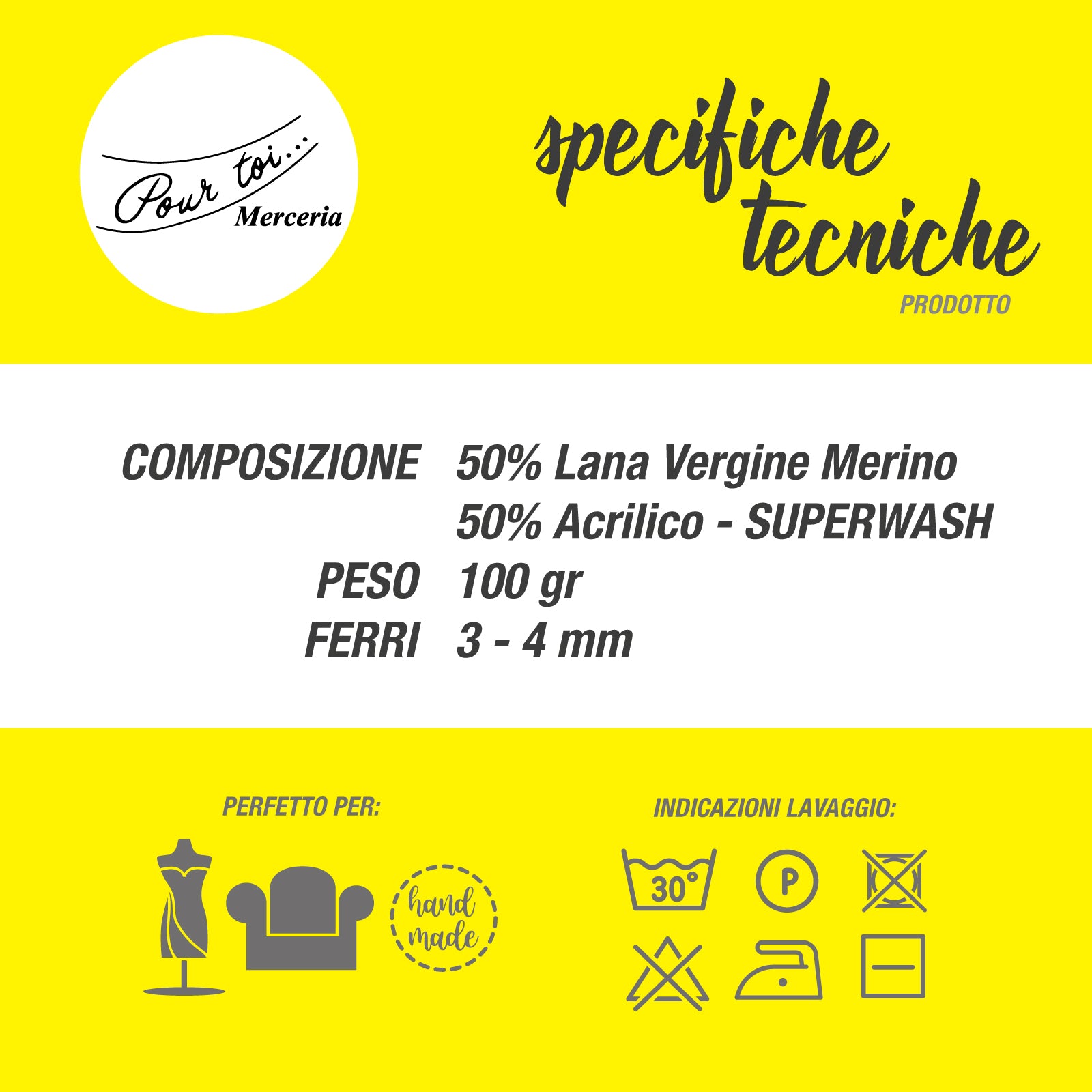 - Composizione: 50% Lana Vergine Merino, 50% Acrilico SUPERWASH
