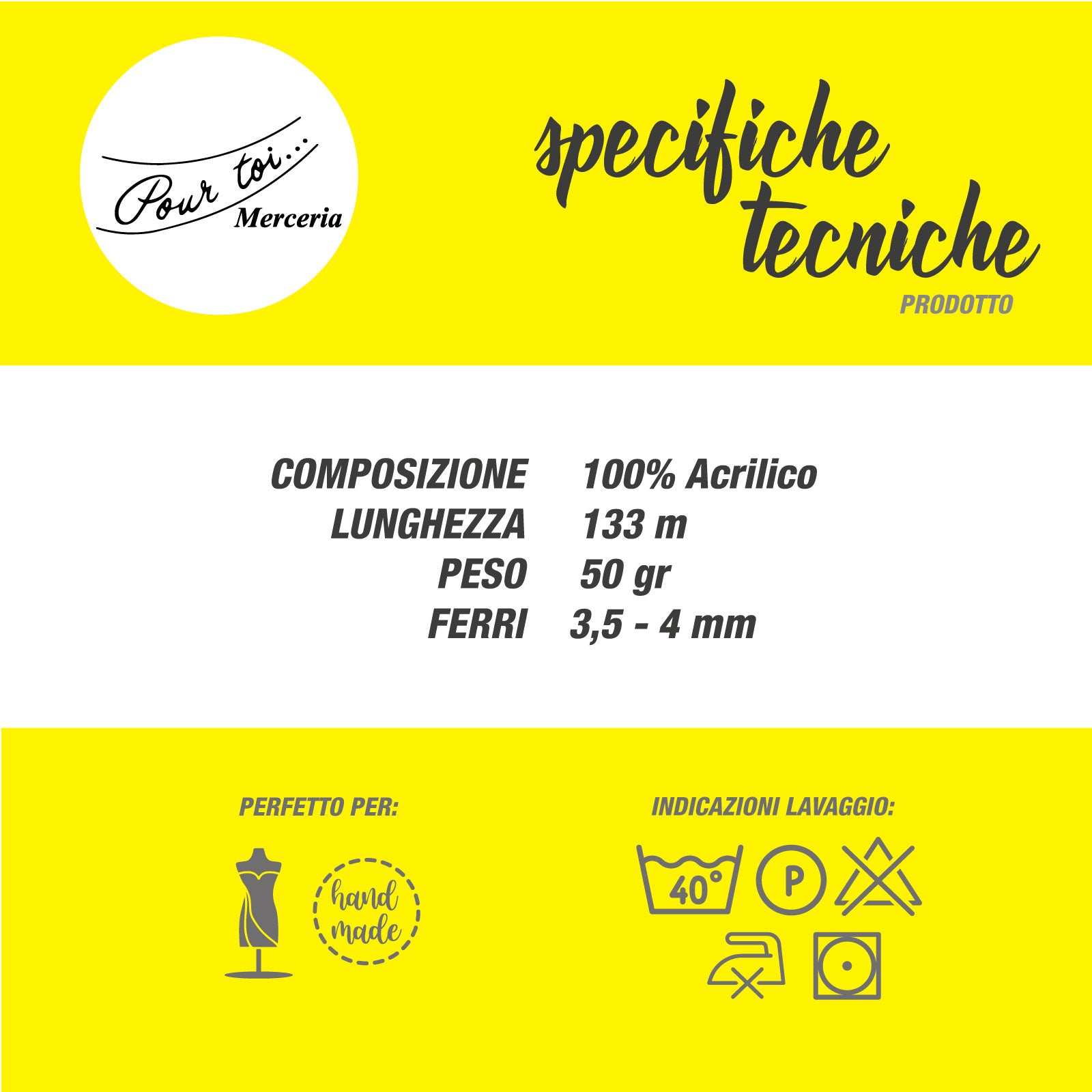 Lana acrilica: Filato morbido al tatto, Ideale per realizzare sia capi da abbigliamento, copertine ed inoltre lavori di hobbistica come amigurumi e simili. Resistente al lavaggio in lavatrice, Consigliamo un lavaggio a mano per far durare piu a lungo la morbidezza e lucentezza del filato. Certificata oeko-tex. Gomitolo 50 gr - 133 Mt - Ferri 3 - 4 mm , 100% Acrilico