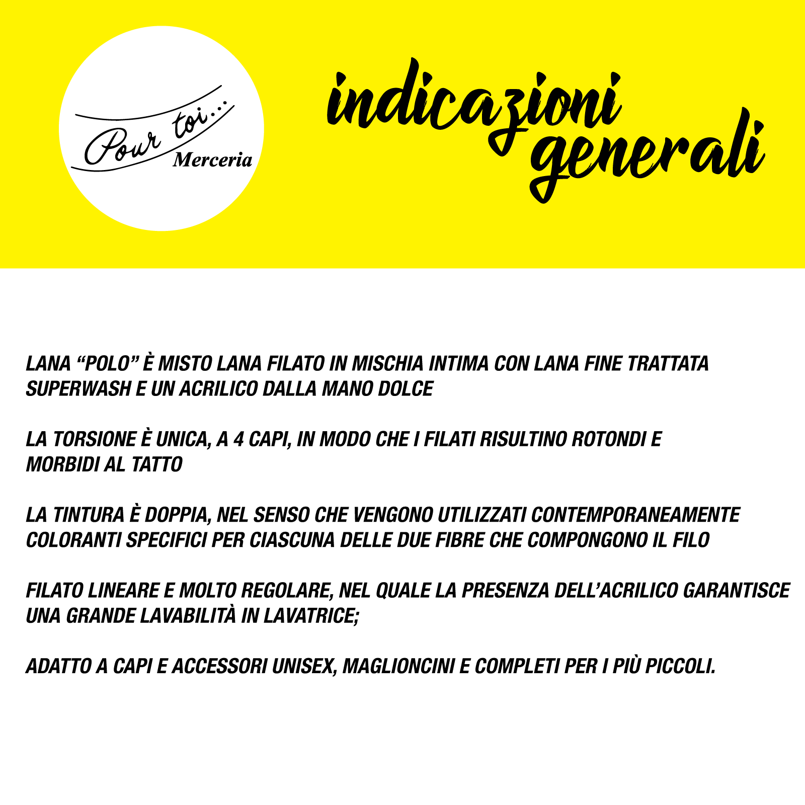 Polo è un misto lana filato in mischia intima con lana Fine trattata Superwash e un acrilico dalla mano dolce. La torsione è unica, a 4 capi, in modo che i filati risultino rotondi e morbidi al tatto; la tintura è doppia, nel senso che vengono utilizzati contemporaneamente coloranti specifici per ciascuna delle due fibre che compongono il filo. Filato lineare e molto regolare, nel quale la presenza dell’acrilico garantisce una grande lavabilità in lavatrice; adatto a capi e accessori unisex, maglioncini e completi per i più piccoli. SUPERWASH.
