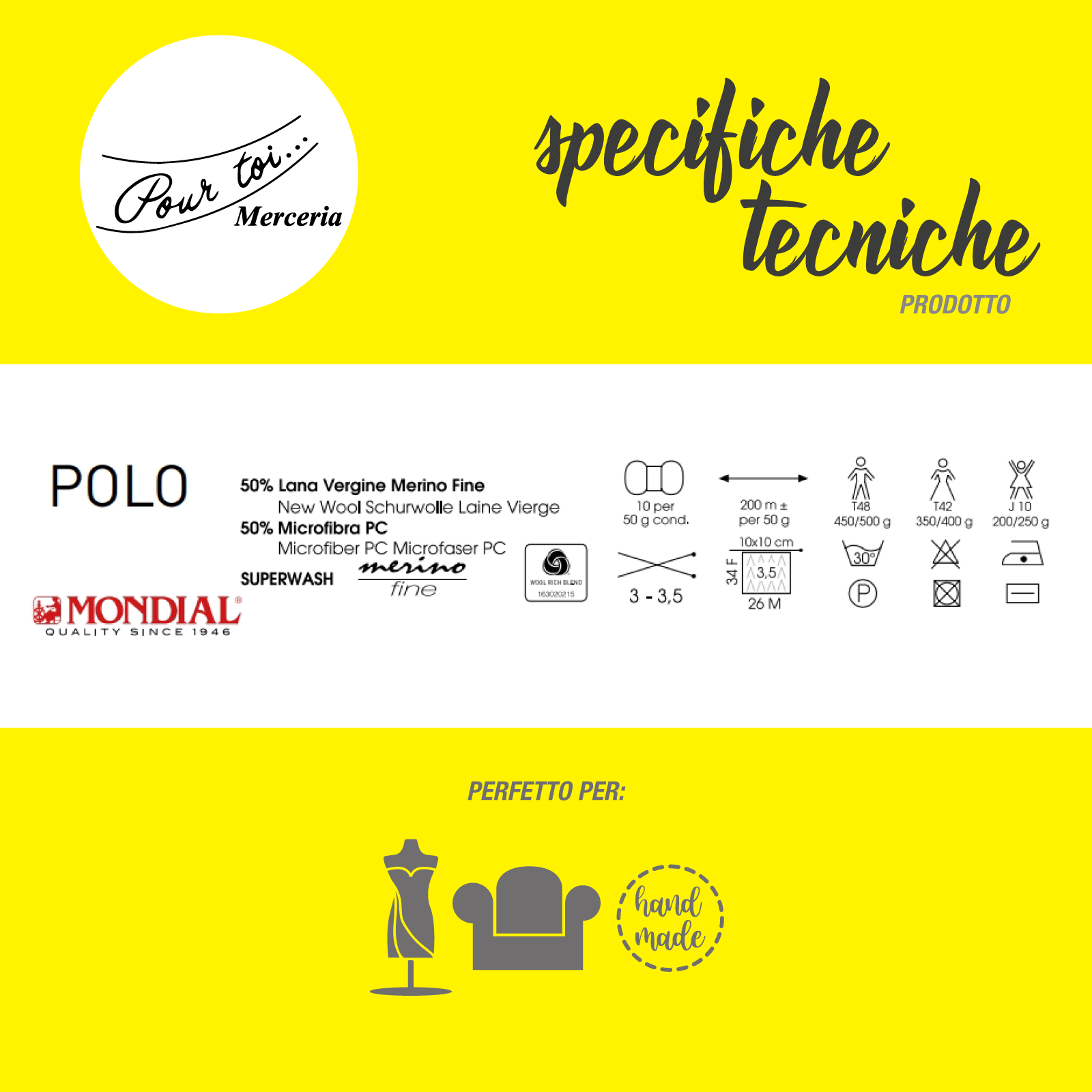 - Composizione: 50% Lana Vergine Merino Fine 50% Microfibra PC Superwash