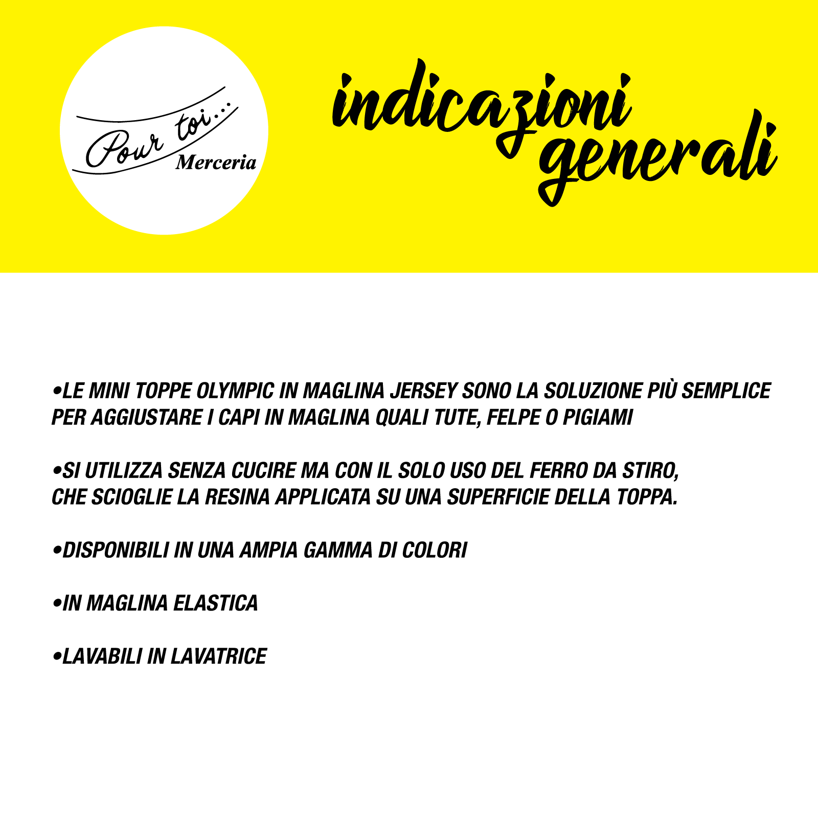 Le Mini Toppe Olympic in maglina sono la soluzione più semplice per aggiustare i capi in maglina quali tute, felpe o pigiami di tutti i bambini esuberanti ed attivi. Tute per il tempo libero o da ginnastica per le attività sportive, oppure maglioni in lana o in cotone che purtroppo si usurano soprattutto su gomiti e ginocchia. La toppa in jersey, prodotta in misura ridotta e proporzionata per i bambini, copre il buco formato durante le normali attività giornaliere o durante un’attività sportiva, tramite una veloce applicazione termoadesiva. La patch termoadesiva si utilizza senza cucire ma con il solo uso del ferro da stiro, che scioglie la resina applicata su una superficie della toppa. Le Mini Toppe per tute sono: In speciale formato ridotto cm 8,5 x cm 13 pensato per la statura dei bambini. Disponibili in una ampia gamma di colori.
