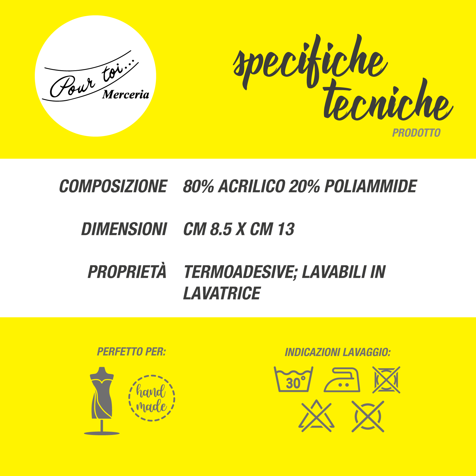 - Specifiche tecniche: maglina elastica, lavabili in lavatrice, senza cucire, termoadesive