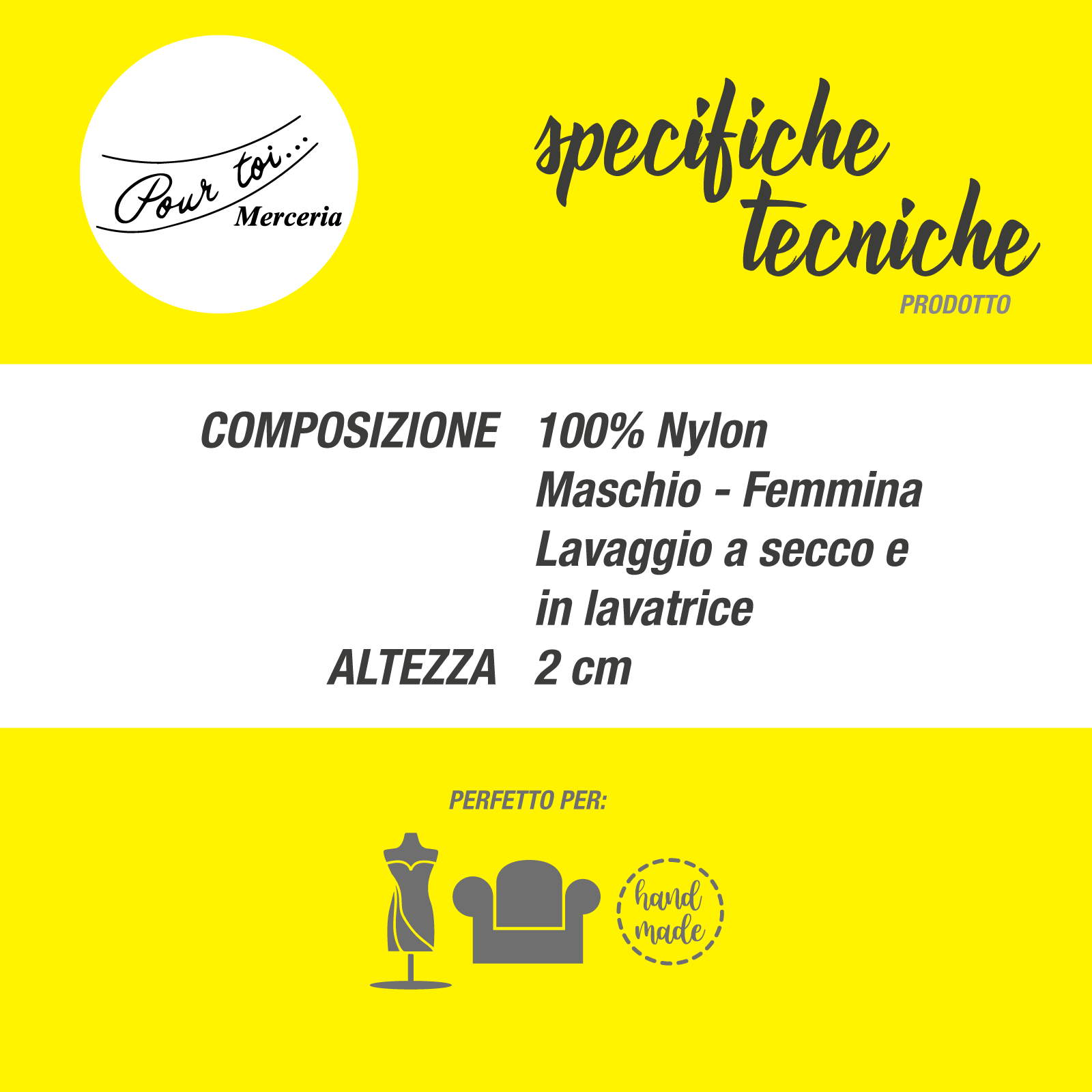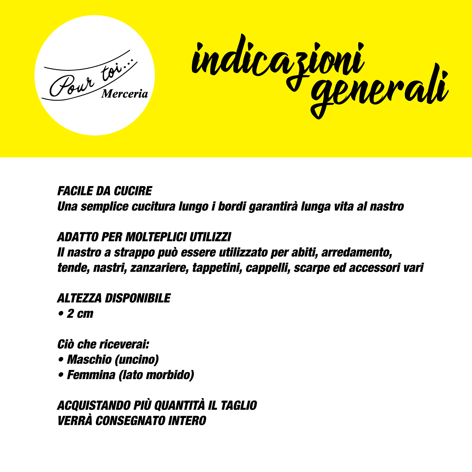 ADATTO PER MOLTEPLICI UTILIZZI Il nastro a strappo può essere utilizzato per abiti, arredamento, tende, nastri, zanzariere, tappetini, cappelli, scarpe ed accessori vari. FACILE DA CUCIRE Una semplice cucitura lungo i bordi garantirà lunga vita al nastro INFORMAZIONI GENERALI Disponibile in varie misure. Ciò che riceverai: -Maschio (uncino) -Femmina (lato morbido).
